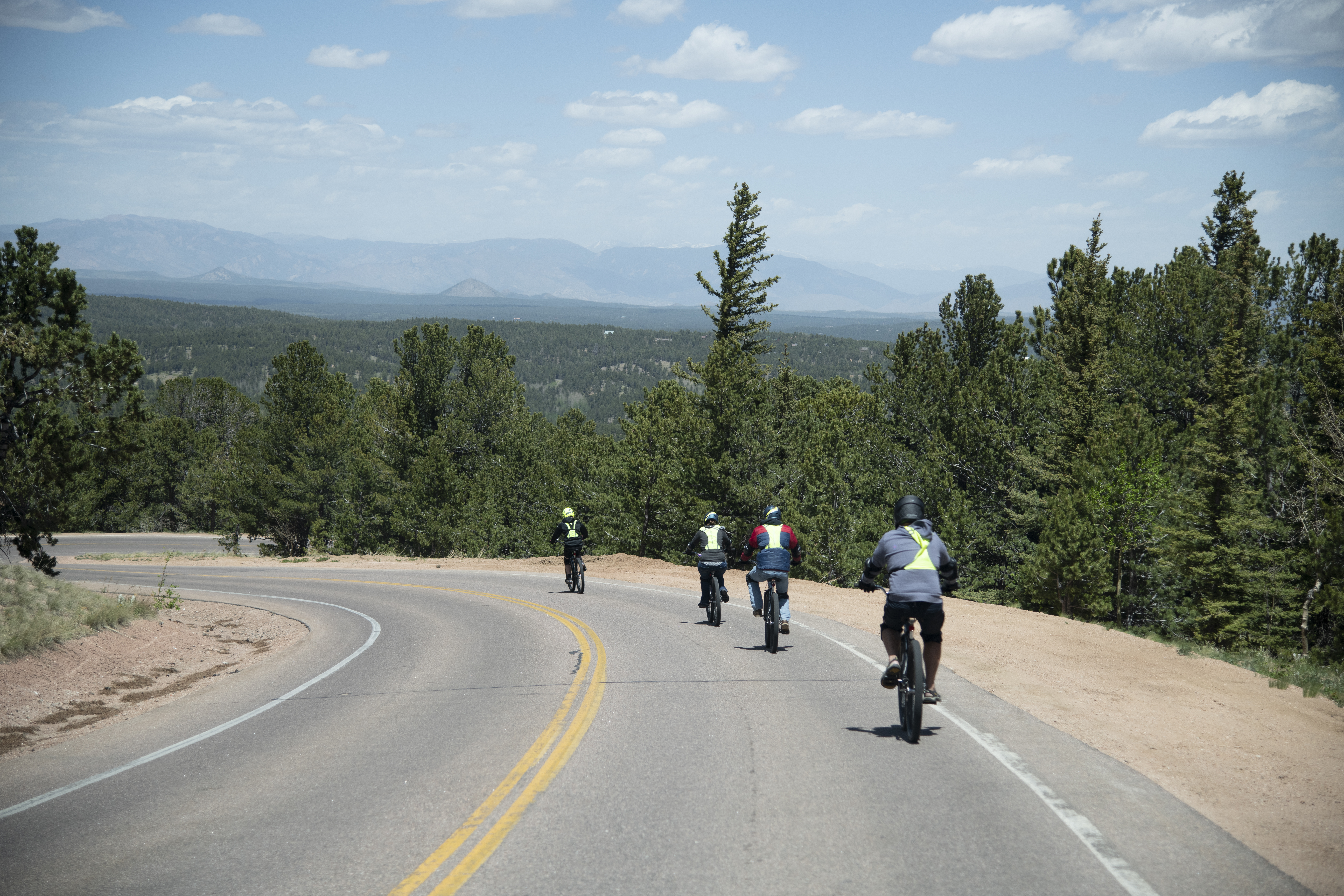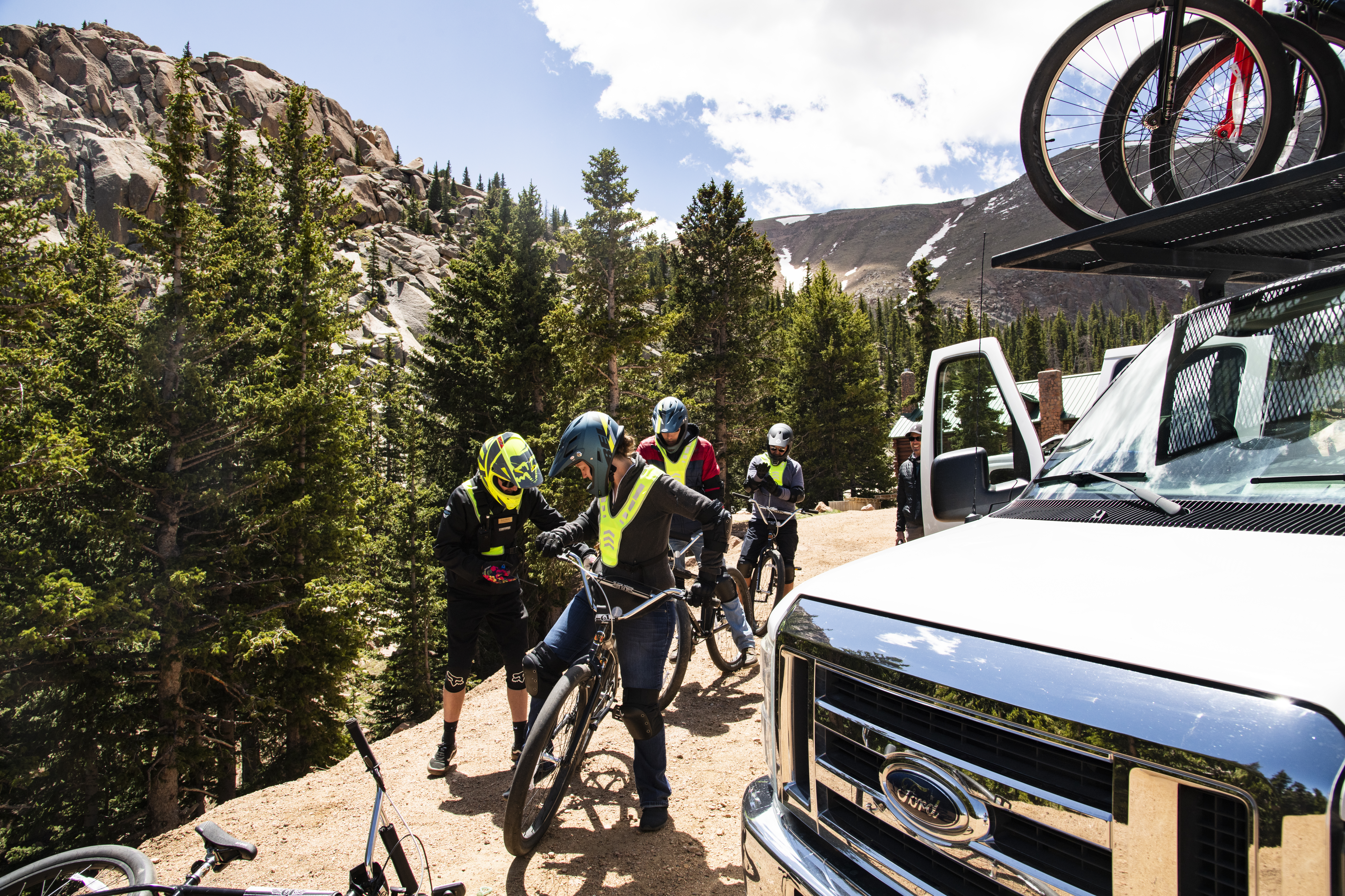 The real adrenaline rush begins as guests gear up for the bike ride down. There is a safety briefing while guests gear up with full-face helmets, elbow and knee pads, gloves, hi-vis vests, and custom-built GT 29” cruisers. This guided bike ride down the winding scenic Pikes Peak Highway offers some of the most sweeping views of Colorado’s magnificent rugged mountain landscapes. And while this unforgettable experience is designed for most abilities, some biking experience is required.